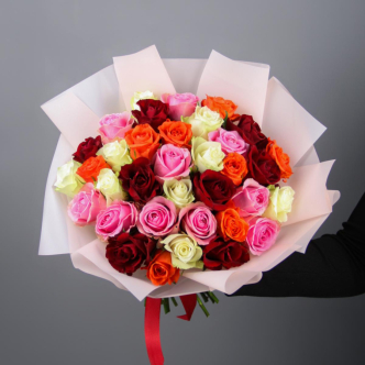Красивый букет из орхидей, роз и гипсофилы в стильном оформлении